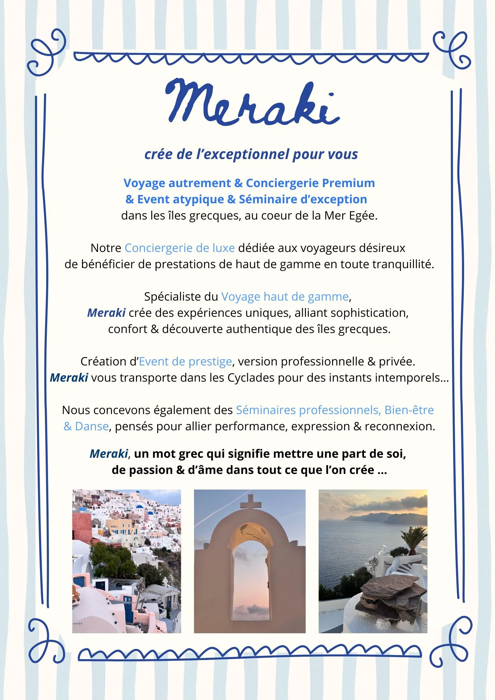 Meraki vous invite à vivre un moment hors du temps, une immersion inspirée des îles grecques, entre douceur de vivre et élégance méditerranéenne.